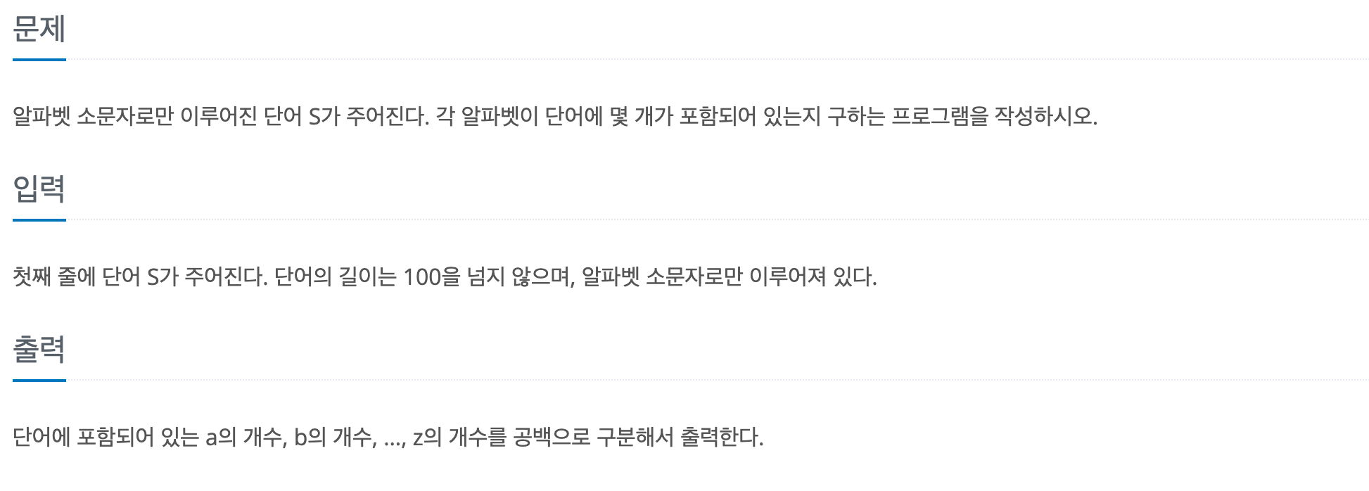 주어진 문자열에 알파벳이 몇 개가 포함되어 있는지 구하는 문제이다.