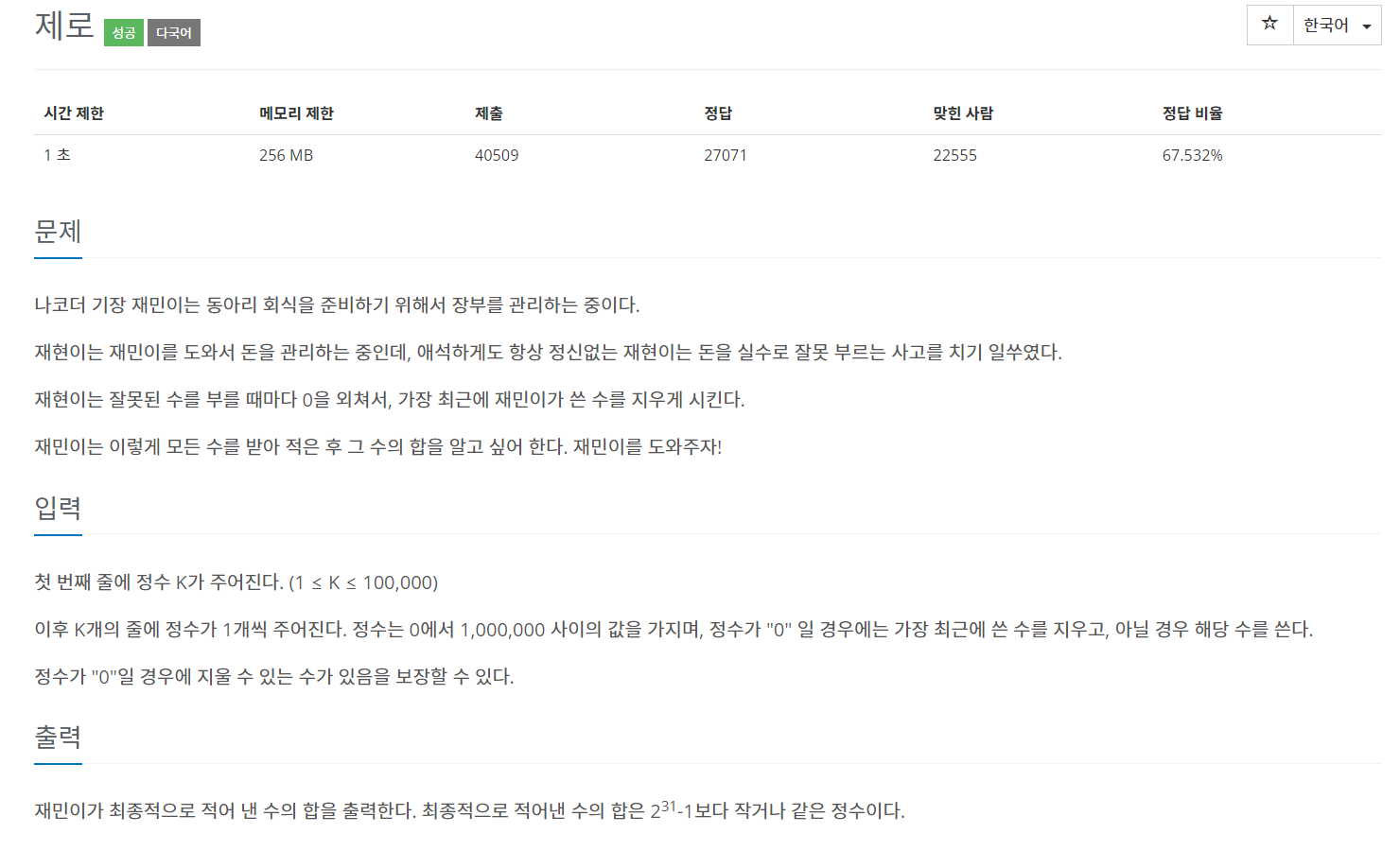 문제의 경우 0이 나오면 앞에 나온 숫자를 지우면 되기 때문에 파이썬에서는 이를 리스트를 이용하여 쉽게 구현해 낼 수 있다. 먼저 변수 a에 숫자를 입력받고 입력받은 숫자만큼 반복문을 돌려 b를 리스트에 삽입한다. 그 이후 b에 0이 나올 때마다 리스트에 가장 나중에 들어온 즉, 맨 뒤의 리스트 요소를 삭제시키고 마지막에 리스트 요소의 총 합을 출력한다.