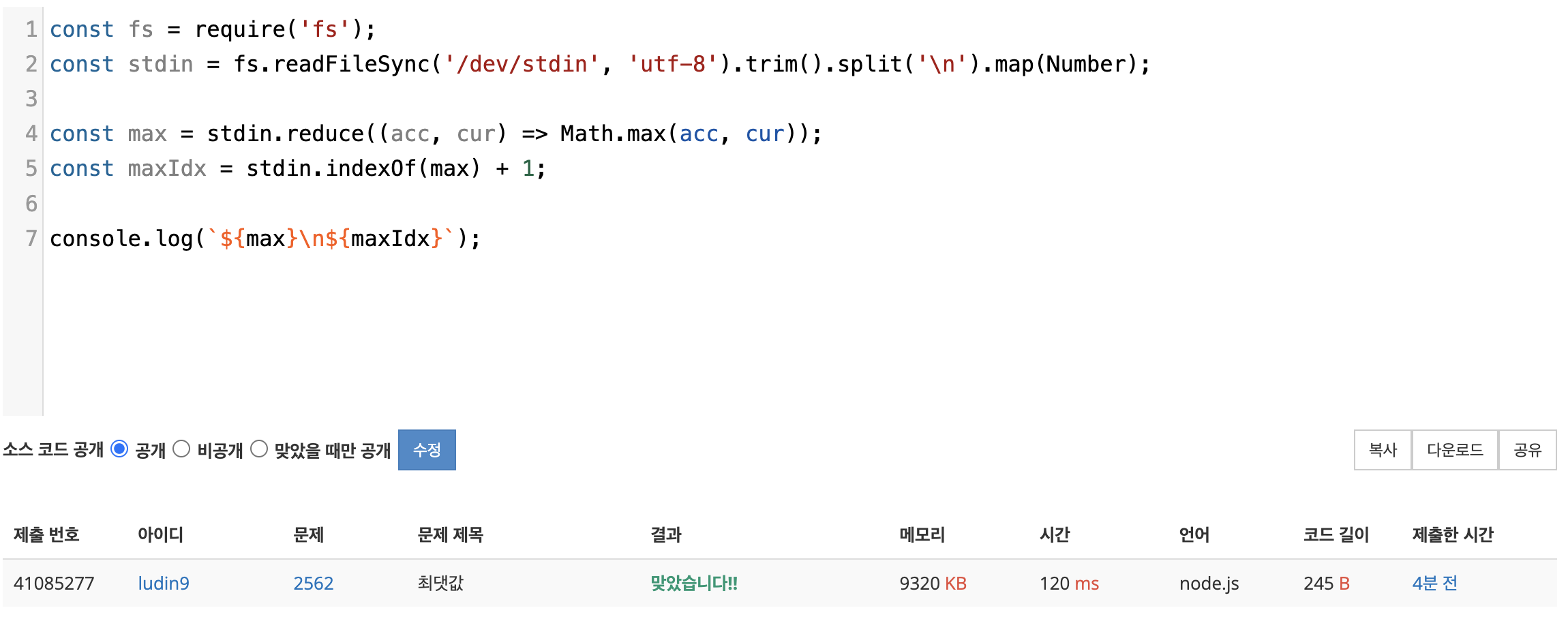 Koala - 6기/기초 알고리즘 스터디 [BOJ/Node.js] 문제 2562 최댓값 KwonPodo 2022. 3. 27. 23:45 https://www.acmicpc.net/problem/2562 2562번: 최댓값 9개의 서로 다른 자연수가 주어질 때, 이들 중 최댓값을 찾고 그 최댓값이 몇 번째 수인지를 구하는 프로그램을 작성하시오. 예를 들어, 서로 다른 9개의 자연수 3, 29, 38, 12, 57, 74, 40, 85, 61 이 주어 www.acmicpc.net 저작자표시 (새창열림)