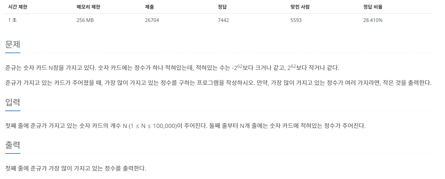 위 문제는 정수 입력값을 딕셔너리에 입력하고 정수가 또 입력 받아지면 딕셔너리의 value 값을 증가시키는 형식으로 코드를 작성하였다. 마지막 출력에는 a 딕셔너리의 key값을 기준으로 정렬시켜 출력시 key값이 가장 작은 수를 출력할 수 있게 하고 이를 다시 딕셔너리로 만들어 value값이 가장 큰 key값 중 그 수가 가장 작은 것을 출력하는 코드를 완성시켰다