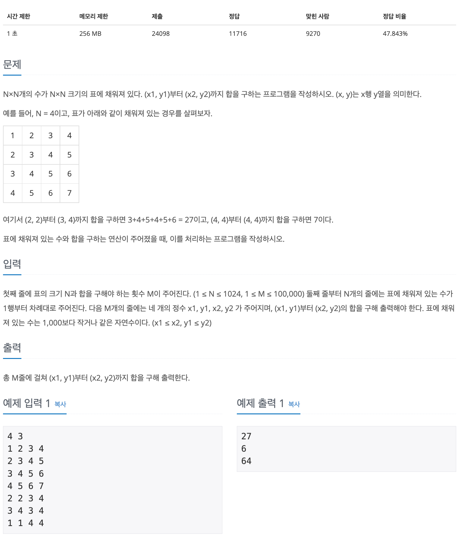 첫째 줄에 표의 크기 N과 합을 구해야 하는 횟수 M이 주어진다. (1 ≤ N ≤ 1024, 1 ≤ M ≤ 100,000) 둘째 줄부터 N개의 줄에는 표에 채워져 있는 수가 1행부터 차례대로 주어진다. 다음 M개의 줄에는 네