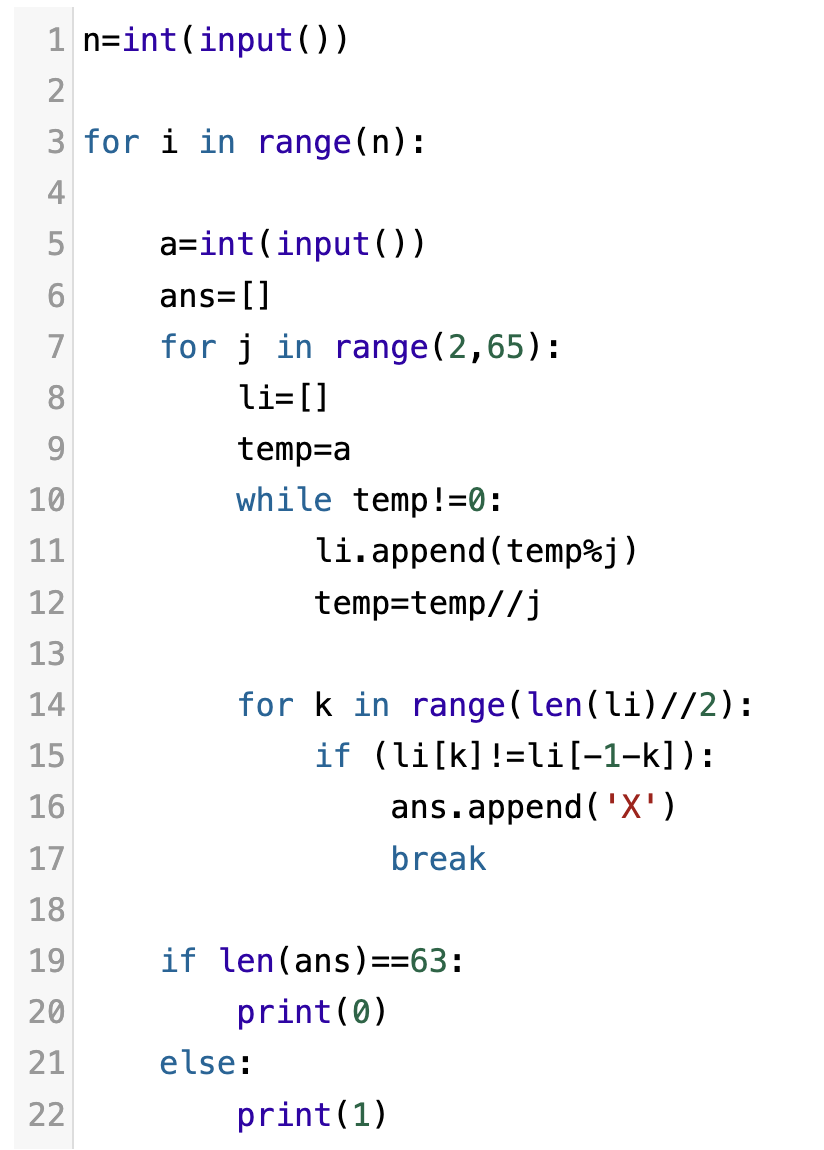 2~64진수로 바꾼 총 63개의 숫자 중 한 개라도 회문이 된다면 1을 출력, 그렇지 않다면 0을 출력하면 된다.