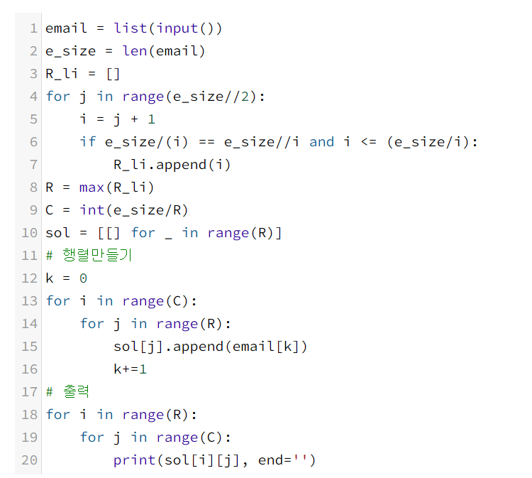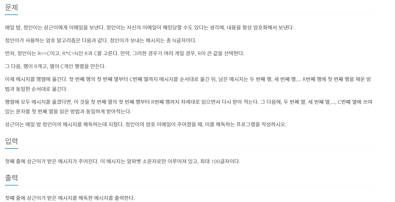 정인이는 원래 "bombonisuuladici"를 보내려고 했다. 이 메시지는 16글자이므로, 정인이는 1*16, 2*8, 4*4 행렬을 선택할 수 있다. R이 가장 큰 것은 4*4이므로, 4*4를 선택한다. 정인이가 만든 행렬은 다음과