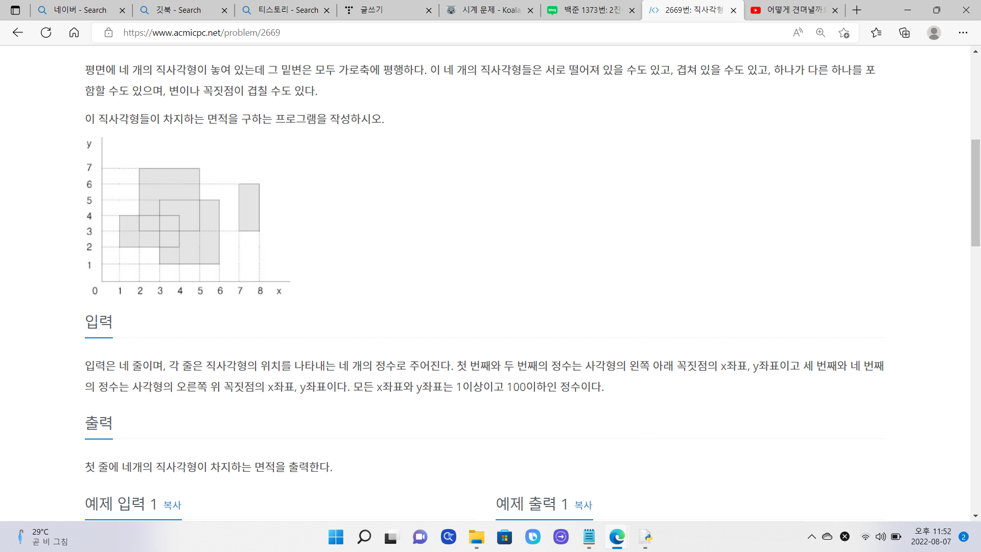 일단 이건 네개의 면적을 구하기 전 일단 [0]으로 100*100칸을 만들어 줘야 한다.(이중 리스트로) 그런 다음 사용자가 4번 값을 입력하면 그 때마다 그 수를 1로 바꾸고 마지막에 전부 다 업데이트? 된 것들 중 다시 한번 그 100*100 을 돌려보면서 1의 개수를 구하면 된다.