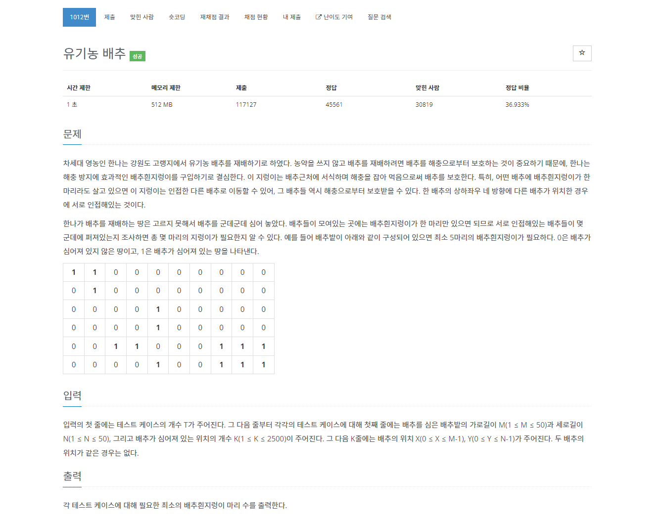 배추를 보호하기 위해 인접해있는 배추 무리마다 배추흰지렁이를 배치하기 위해서 배추흰지렁이가 얼마나 필요한지를 구하는 문제이다. 배추는 상하좌우 네 방향으로 붙어있는 경우에 인접한 것이다. 인접한 배추 무리가 몇 개인지 구하면 된다. 너비우선탐색(BFS)를 통해 문제를 풀 수 있다.