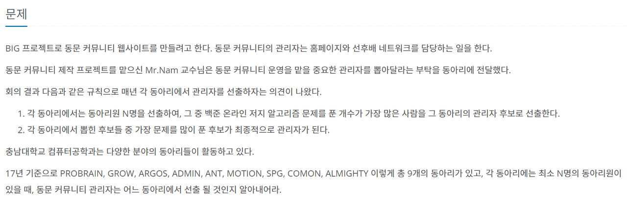 PROBRAIN, GROW, ARGOS, ADMIN, ANT, MOTION, SPG, COMON, ALMIGHTY중 동문 커뮤니티 관리자로 선발되는 후보가 소속한 동아리의 이름을 대문자로 출력한다.