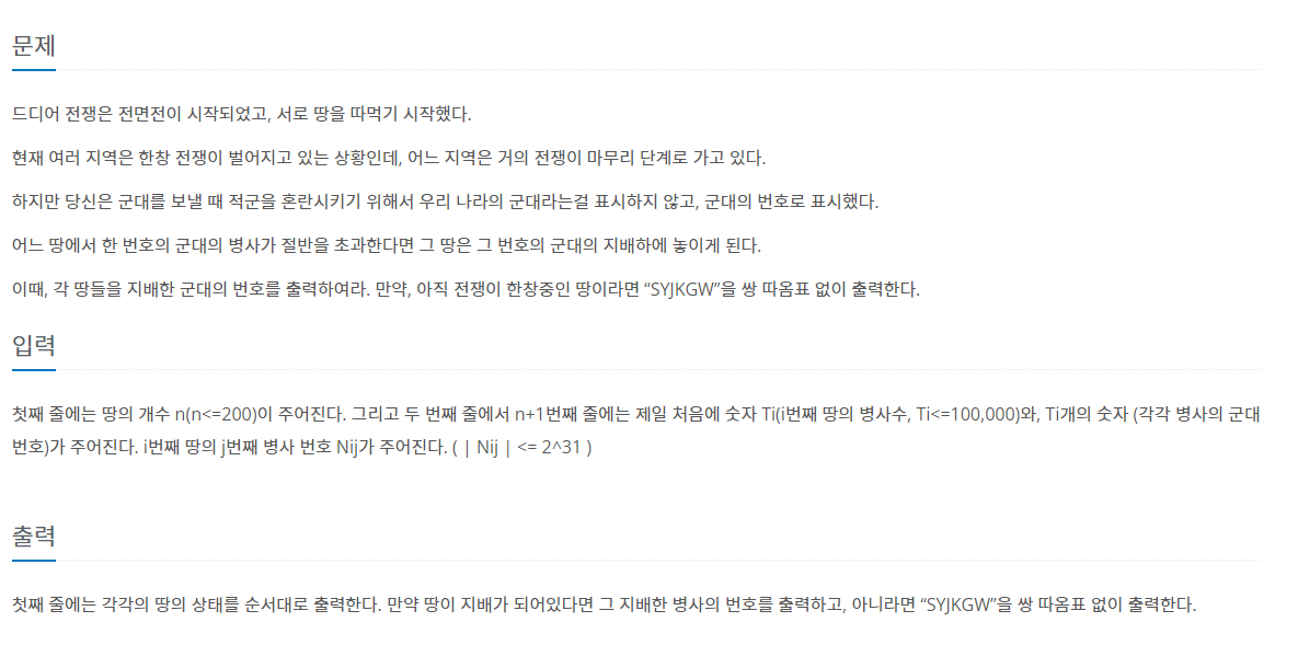 첫째 줄에는 땅의 개수 n(n<=200)이 주어진다. 그리고 두 번째 줄에서 n+1번째 줄에는 제일 처음에 숫자 Ti(i번째 땅의 병사수, Ti<=100,000)와, Ti개의 숫자 (각각 병사의 군대 번호)가 주어진다. i번째 땅