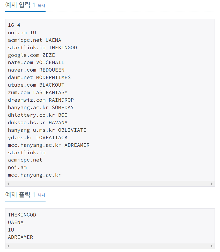 두번째 줄부터 N개의 줄에 걸쳐 각 줄에 사이트 주소와 비밀번호가 공백으로 구분되어 주어진다. 사이트 주소는 알파벳 소문자, 알파벳 대문자, 대시('-'), 마침표('.')로 이루어져 있고, 중복되지 않는다. 비밀번호는 알파벳 대문자로만 이루어져 있다. 모두 길이는 최대 20자이다. N+2번째 줄부터 M개의 줄에 걸쳐 비밀번호를 찾으려는 사이트 주소가 한줄에 하나씩 입력된다. 이때, 반드시 이미 저장된 사이트 주소가 입력된다.