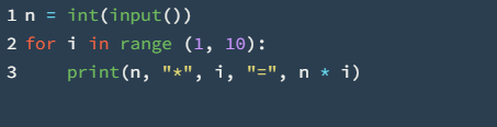 이 때이때 i가 1부터 9까지 반복되므로 반복문 for을 이용하였다. 이때 range 함수를 이용해 1부터 (10-1)까지의 범위를 입력할 수 있다.