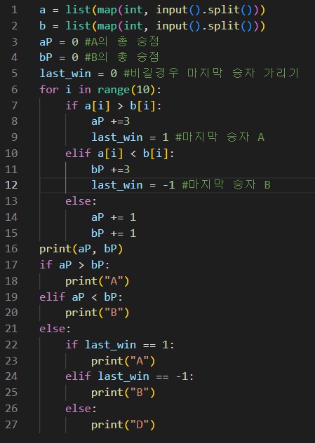 Koala - 9기/기초 알고리즘 스터디 [백준/Python] 2511번 카드놀이 최숩 2023. 1. 11. 23:08 2511번: 카드놀이 첫 번째 줄에는 게임이 끝난 후, A와 B가 받은 총 승점을 순서대로 빈칸을 사이에 두고 출력한다. 두 번째 줄에는 이긴 사람이 A인지 B인지 결정해서, 이긴 사람을 문자 A 또는 B로 출력한다. 만약 www.acmicpc.net 문제코드 저작자표시 (새창열림)