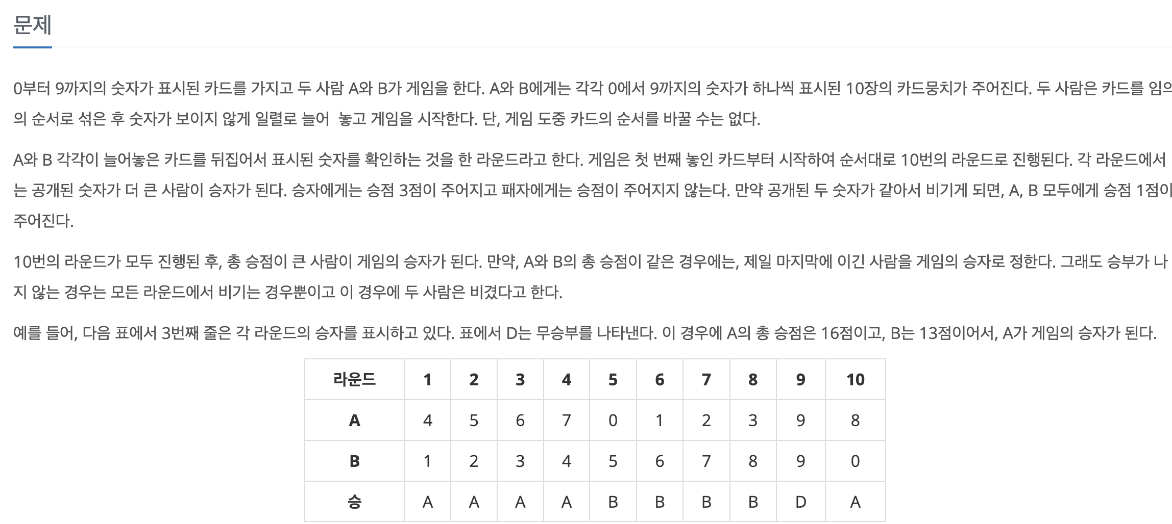 그런데 문제에서 무승부의 조건이 A,B의 점수 합이 동일 할 때가 아니고 카드배열이 모두 동일할 때에만 한정하였음(문제를 제대로읽기)