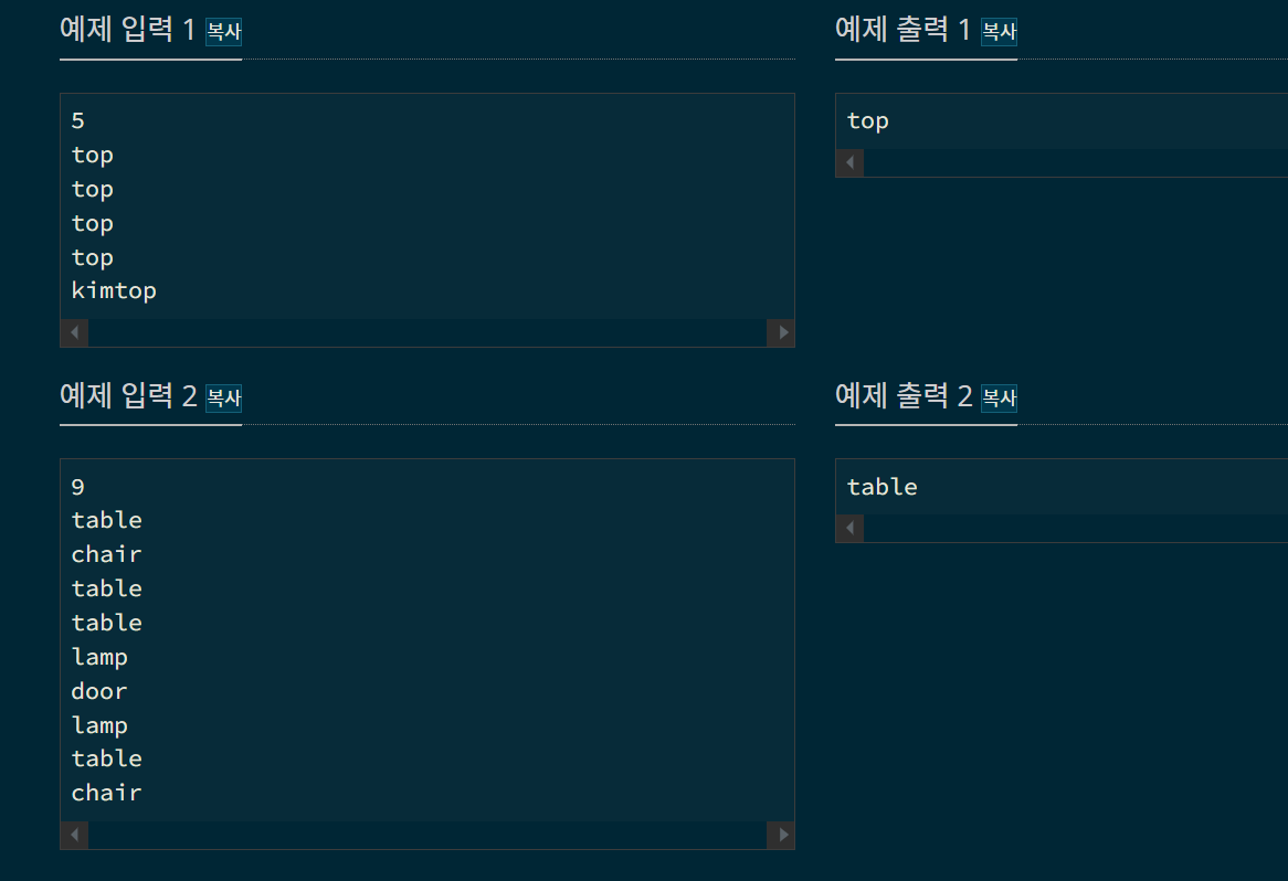 오늘 하루 동안 팔린 책의 제목이 입력으로 들어왔을 때, 가장 많이 팔린 책의 제목을 출력하는 프로그램을 작성하시오.
