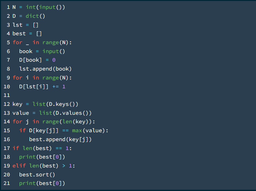 첫째 줄에 가장 많이 팔린 책의 제목을 출력한다. 만약 가장 많이 팔린 책이 여러 개일 경우에는 사전 순으로 가장 앞서는 제목을 출력한다.