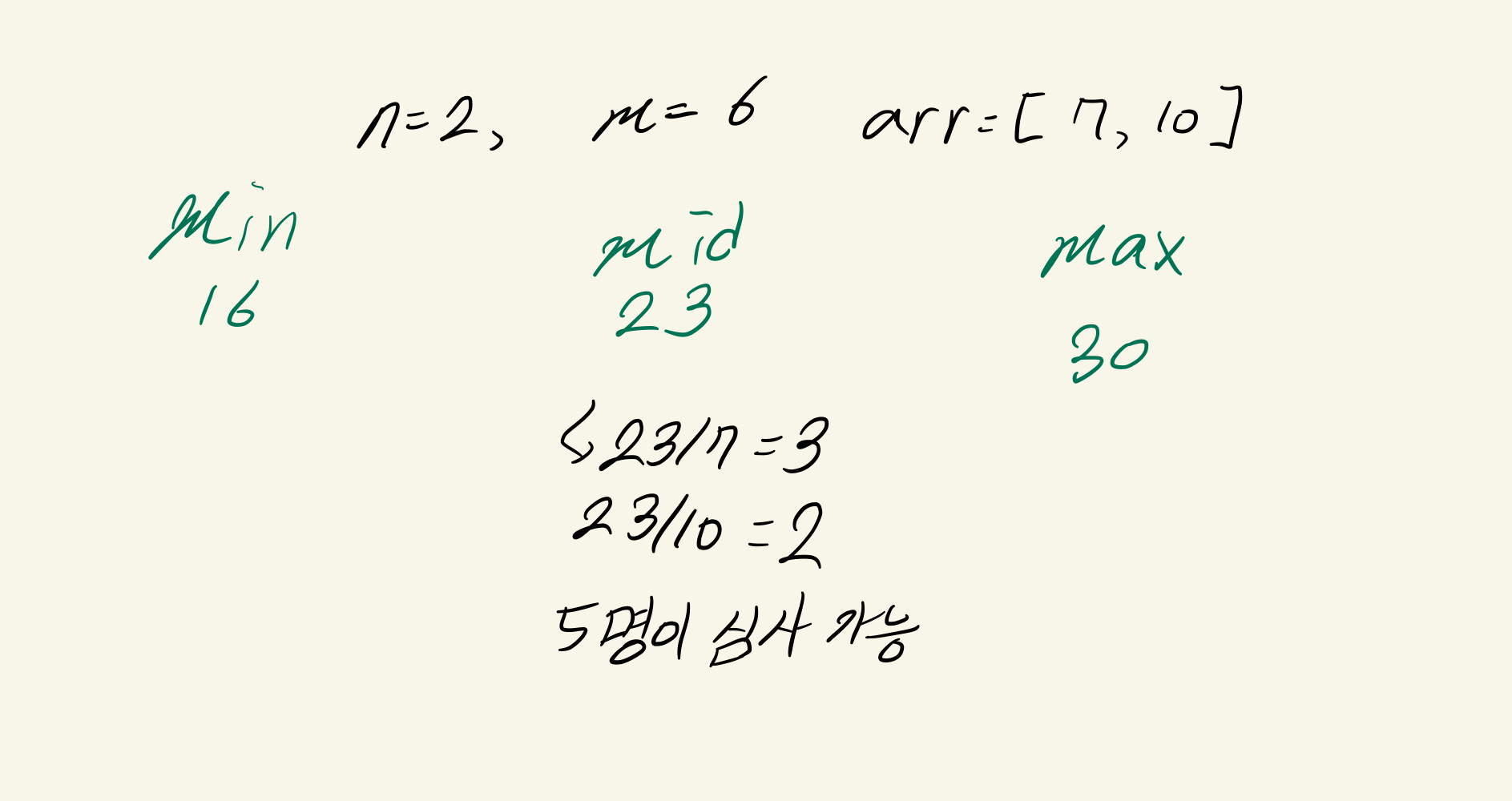 23초가 주어진 경우에는 5명이 심사가 가능합니다. 6명이 심사를 받아야 하므로 시간초를 늘리기 위해 left를 mid+1해줍니다.