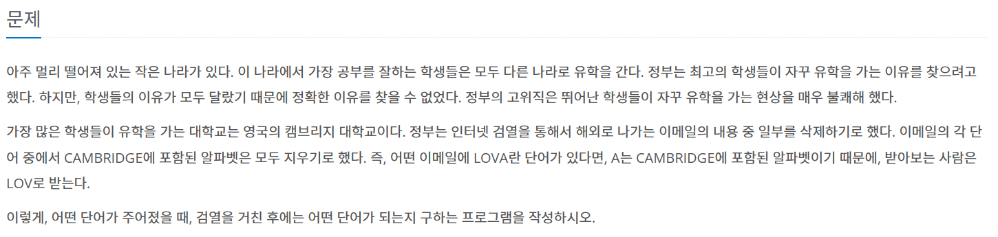 - 삭제해야 되는 알파벳들을 포함한 문자열인 'CAMBRIDGE'를 delw에 저장