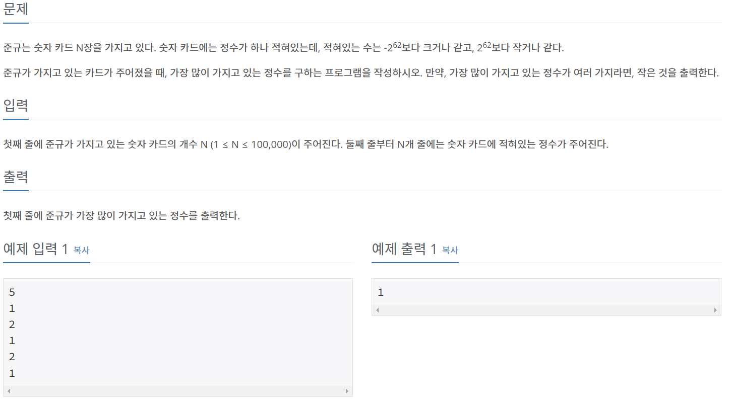 이전에 연습했던 딕셔너리 문제와 비슷해보여서 막힘없이 풀었다. 단순히 딕셔너리에 이미있으면 1더해주고 없으면 1저장하는식으로 입력하고 가장 큰수를 가져와서 그 key를 출력했다.