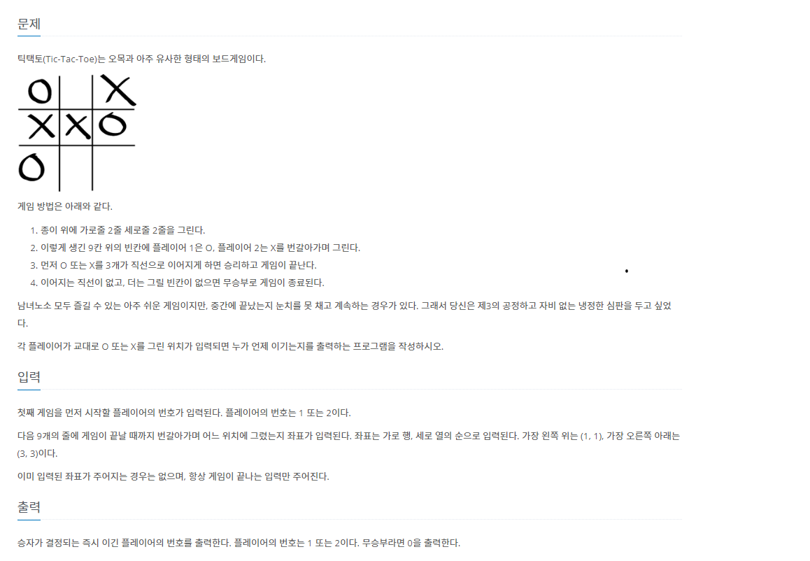 승자가 결정되는 즉시 이긴 플레이어의 번호를 출력한다. 플레이어의 번호는 1 또는 2이다. 무승부라면 0을 출력한다.