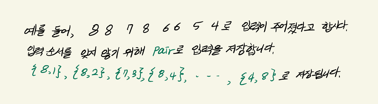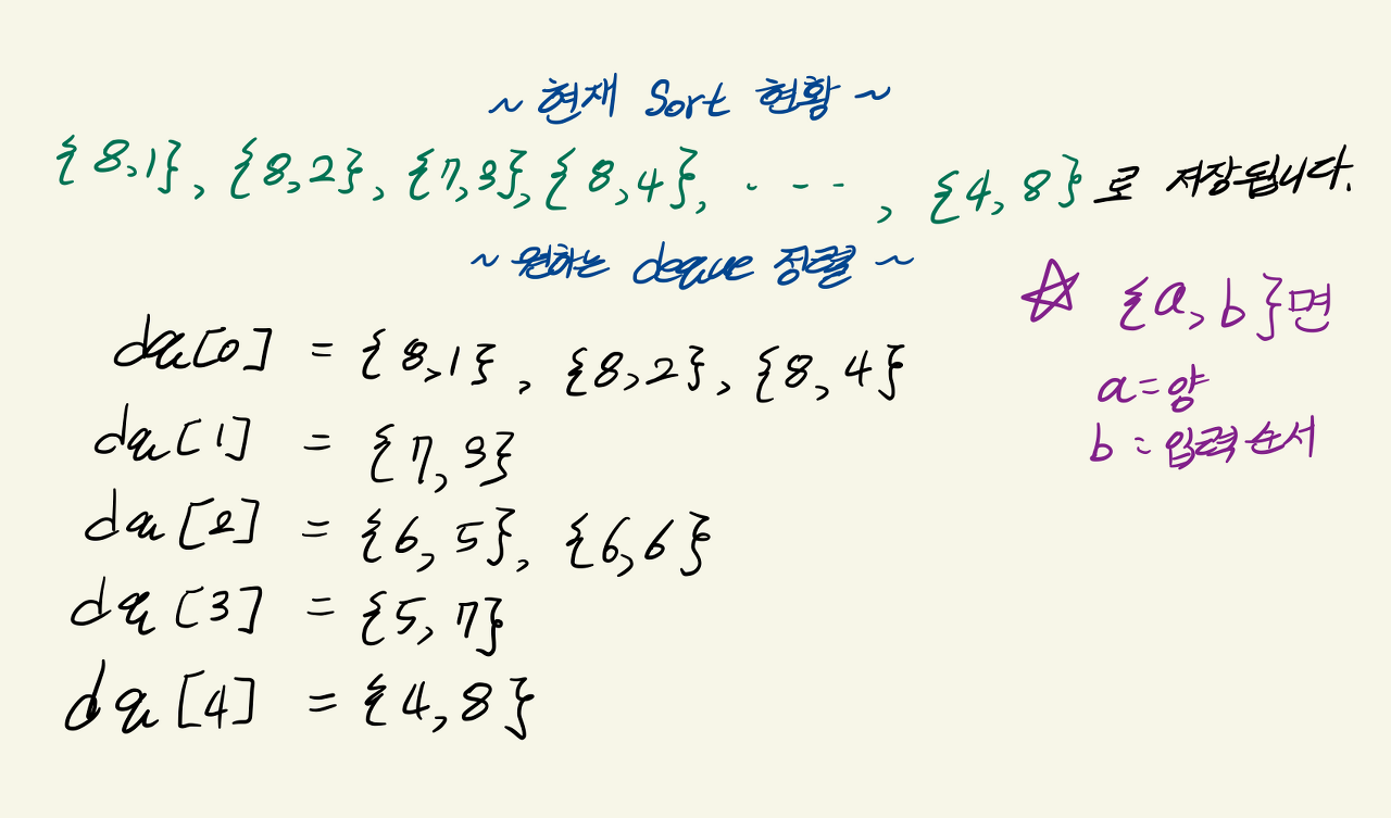 2. pair의 원소에서 first가 같다면, second가 오름차순이 될 것 -> 이렇게 하면 같은 양의 아이스크림이 입력 순서로 저장되어 stable sort가 된다.
