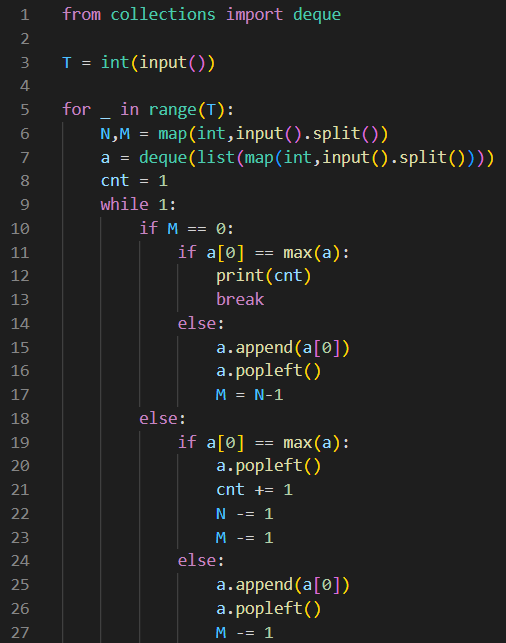 2-1) 가장 큰 수라면 이를 popleft 하고 a[0]이 제거되었으므로 문서의 개수 N 과 원하는 문서의 번호인 M 을 -1 해줌.