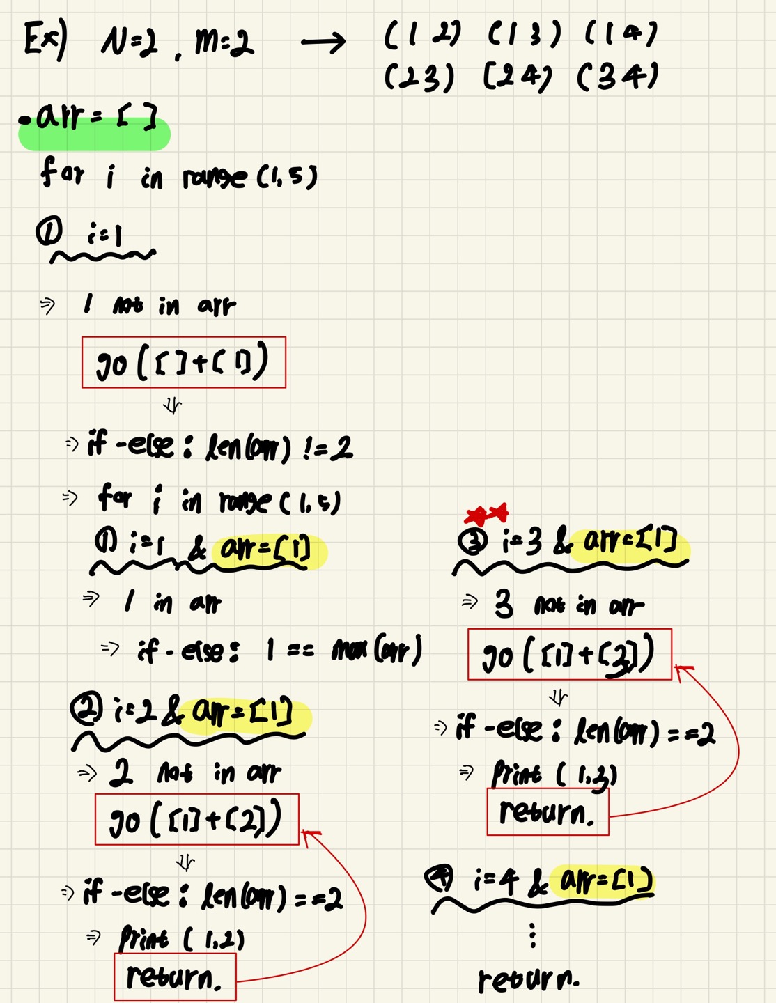 len(arr) == m 일 시 리스트 arr를 출력하고,