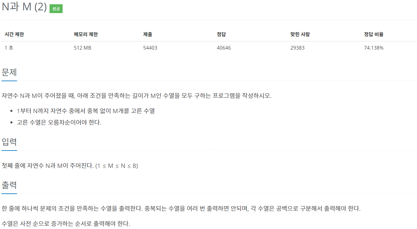 1 ~ n 까지의 자연수 에서 m 길이 만큼의 조합을 출력하는 문제다.