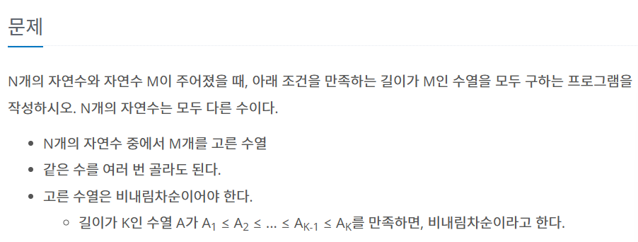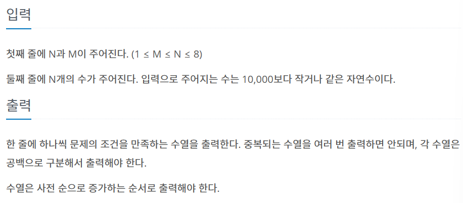 N개의 자연수와 자연수 M이 주어졌을 때, 아래 조건을 만족하는 길이가 M인 수열을 모두 구하는 프로그램을 작성하시오. N개의 자연수는 모두 다른 수이다. N개의 자연수 중에서 M개를 고른 수열