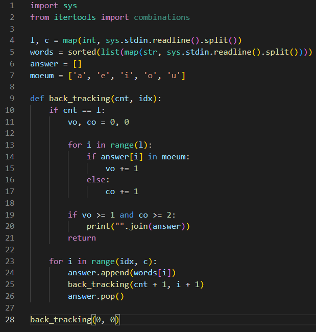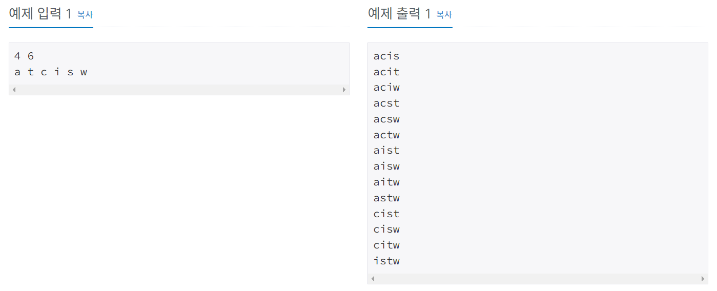 Koala - 9기/기초 알고리즘 스터디 [백준/Python] 1759번 암호 만들기 최숩 2023. 2. 27. 01:10 1759번: 암호 만들기 첫째 줄에 두 정수 L, C가 주어진다. (3 ≤ L ≤ C ≤ 15) 다음 줄에는 C개의 문자들이 공백으로 구분되어 주어진다. 주어지는 문자들은 알파벳 소문자이며, 중복되는 것은 없다. www.acmicpc.net 문제코드 저작자표시 (새창열림)