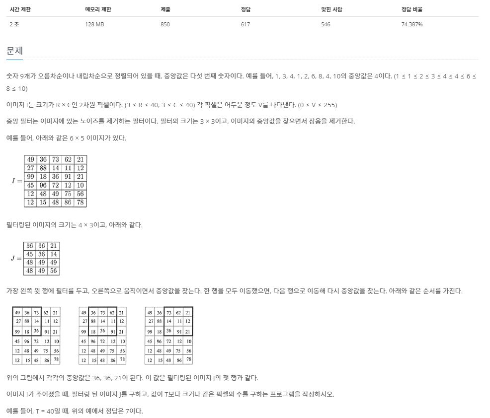 숫자 9개가 오름차순이나 내림차순으로 정렬되어 있을 때, 중앙값은 다섯 번째 숫자이다. 예를 들어, 1, 3, 4, 1, 2, 6, 8, 4, 10의 중앙값은 4이다. (1 ≤ 1 ≤ 2 ≤ 3 ≤ 4 ≤ 4 ≤ 6 ≤ 8 ≤ 10) 이미지 I는
