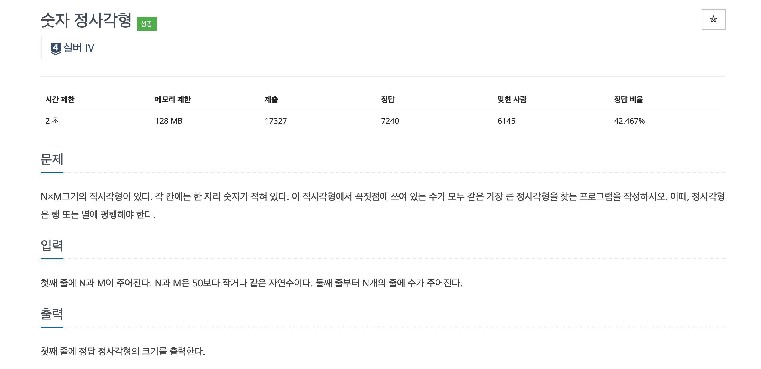 N×M크기의 직사각형이 있다. 각 칸에는 한 자리 숫자가 적혀 있다. 이 직사각형에서 꼭짓점에 쓰여 있는 수가 모두 같은 가장 큰 정사각형을 찾는 프로그램을 작성하시오. 이때, 정사각형은 행