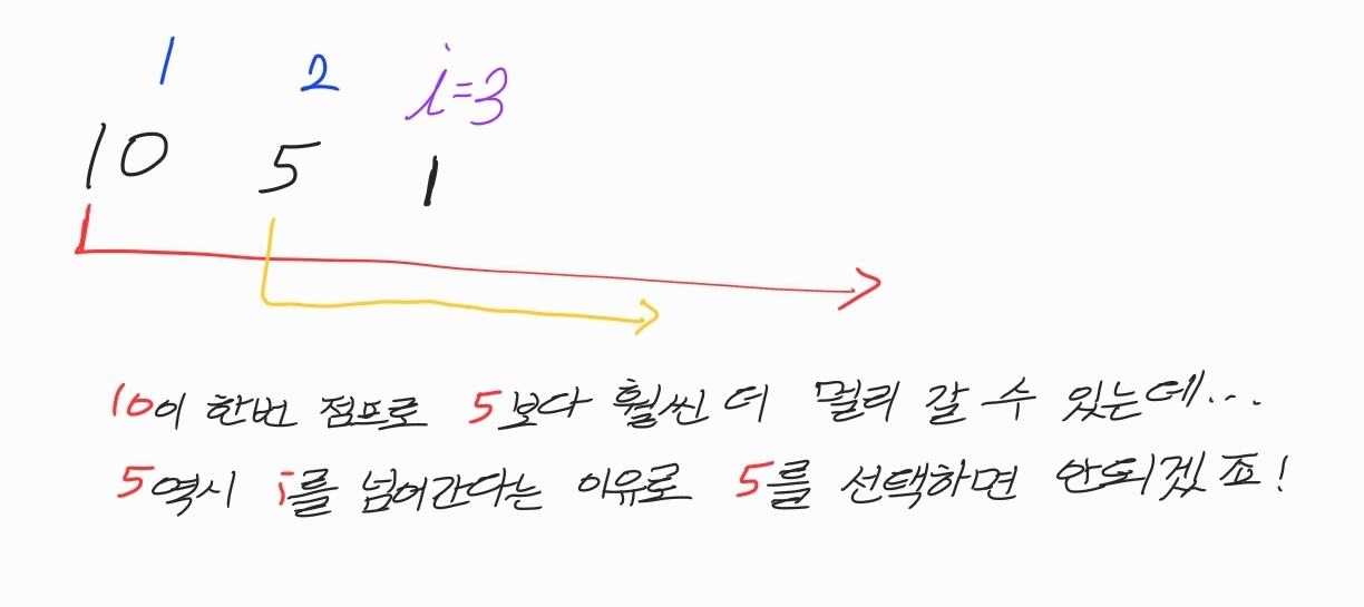 가장 최소의 점프로 멀리 가려면, 점프를 아끼면서 최대한 멀리멀리 가는 경우를 찾아야 합니다.