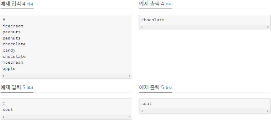 첫째 줄에 오늘 하루 동안 팔린 책의 개수 N이 주어진다. 이 값은 1,000보다 작거나 같은 자연수이다. 둘째부터 N개의 줄에 책의 제목이 입력으로 들어온다. 책의 제목의 길이는 50보다 작거나 같고