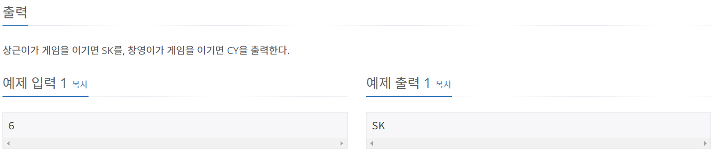 상근이가 게임을 이기면 SK를, 창영이가 게임을 이기면 CY을 출력한다.