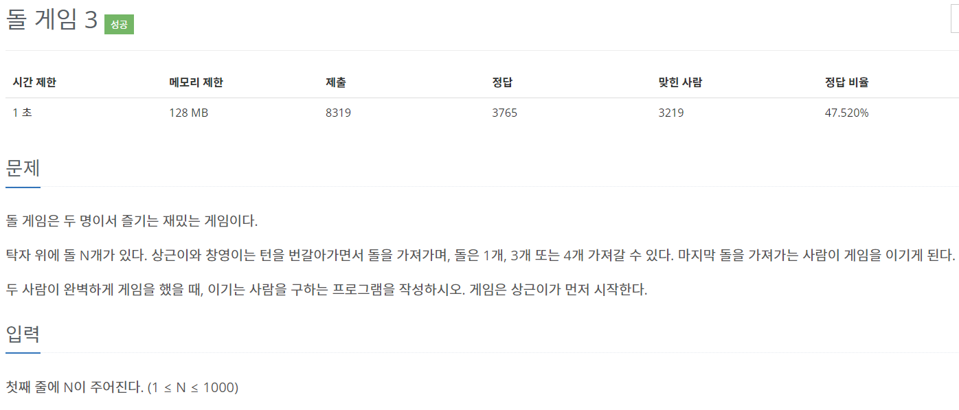 상근이부터 시작할 때 돌이 1개, 3개, 4개 있을 때는 무조건 상근이가 승리할 수 있다. 돌이 2개일 때는 상근이는 1개 밖에 가져갈 수 밖에 없기 때문에 창영이가 승리한다. 돌이 5개 이상일 때는 한 번에 게임을 끝낼 수 없기 때문에 상근이가 1개 혹은 3개 혹은 4개를 가져갔을 때 남은 돌의 갯수에 따라 승리하는 사람을 구해보면 된다.